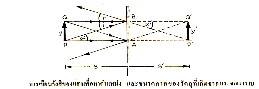 PA เป็นเส้นแนวฉาก QA ให้ตกกระทบและสะท้อน จากนั้นต่อแนวรังสีทุกเส้นไปด้านหลังกระจกจะได้ตำแหน่งและขนาดของภาพ