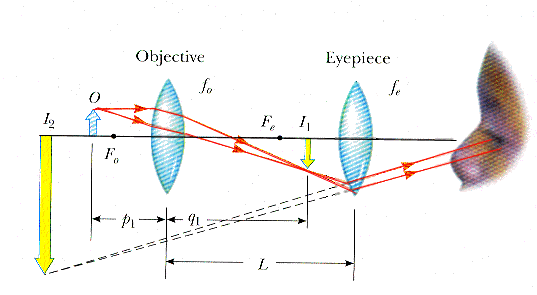 ภาพด้านขวาแสดงกล้องจุลทรรศน์แบบใช้แสง ภาพด้านซ้ายแสดงการเกิดภายขยายของวัตถุเมื่อมองโดยกล้องจุลทรรศน์                การใช้กล้องจุลทรรศน์มองวัตถุเล็กๆ ต้องปรับให้เลนส์ใกล้วัตถุอยู่ห่างจากวัตถุเป็นระยะทางมากกว่าความยาวโฟกัสของเลนส์ใกล้วัตถุ และ เมื่อเรามองผ่านเลนส์ทั้งสองเพื่อมองภาพของวัตถุภาพที่เห็นจากกล้องจุลทรรศน์จะเป็นภาพเสมือนหัวกลับขนาดขยาย ขั้นตอนการเกิดภาพจากเลนส์ใกล้วัตถุและใกล้ตา 1.ปรับกล้องจุลทรรศน์จนระยะห่างระหว่างเลนส์ใกล้วัตถุกับวัตถุอยู่ห่างกันเป็นระยะมากกว่าความยาวโฟกัสของเลนส์ใกล้วัตถุ 2.แสงจากวัตถุจะหักเหผ่านเลนส์ใกล้วัตถุทำให้เกิดภาพจริง ขนาดใหญ่กว่าวัตถุ(ภาพหัวกลับเมื่อเทียบกับวัตถุ) คือภาพ I1โดยภาพI1ที่เกิดขึ้นนี้จะอยู่ระหว่างเลนส์ทั้งสองและอยู่ที่ระยะน้อยกว่าความยาวโฟกัสของเลนส์ใกล้ตา 3.ภาพ I1นี้จะทำหน้าที่เป็นวัตถุอีกครั้งเมื่อเทียบกับเลนส์อันที่2คือเลนส์ใกล้ตาทำให้เกิดภาพครั้งที่สองเป็นภาพเสมือนขนาดใหญ่(ภาพหัวกลับเมื่อเทียบวัตถุจริง)คือภาพ I2 ซึ่งเป็นภาพที่ตาเรามองเห็นจริงๆในกล้องจุลทรรศน์ เพราะฉะนั้นภาพที่มองห็นจากกล้องจุลทรรศน์เป็นภาพเสมือนหัวกลับขนาดใหญ่                การขยายของกล้องจุลทรรศน์=ผลคูณของการขยายของเลนส์ใกล้ตากับการขยายของเลนส์ใกล้วัตถุ